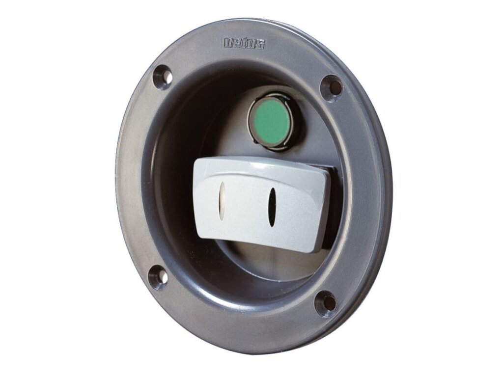 Boegschroefpaneel voor zijmontage, met verlichte tuimelschakelaar. Waterdicht volgens IP65. Diameter 102 mm.