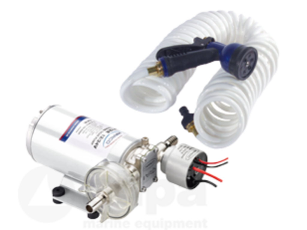 Zelfaanzuigende dekwaskit met elektronische drukschakelaar en accessoires.