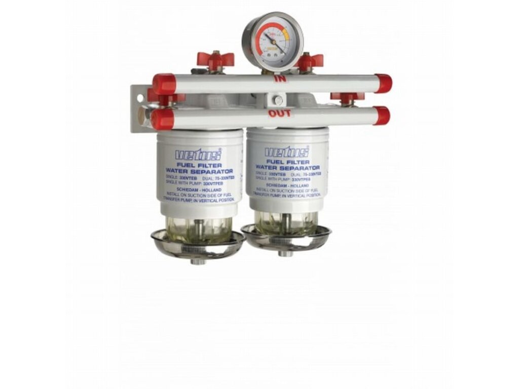 Met deze dubbele filters heeft u altijd een schoon filter ”stand by”. Door het omzetten van de kranen schakelt u direct een schoon filter in, en kunt u eventueel het vervuilde filter bij lopende motor vervangen.