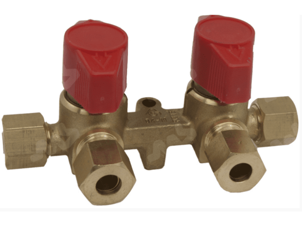 Gaskraan verdeelblok met twee kranen voorzien van messing wartels en snijringen en geschikt voor scheepsvaart.
