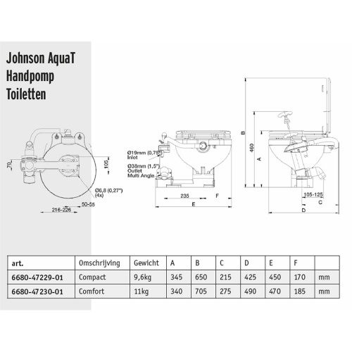Afmetingen A=340mm, B=705mm, C=275mm, D=490mm, E=470mm, F=185mm, inlaat Ø19mm, uitlaat Ø38mm, gewicht 9,6kg ( Soft-Close )
