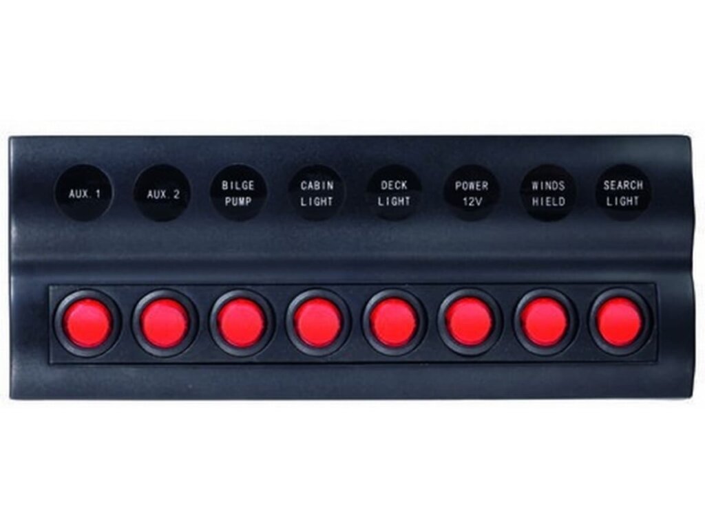 ABS, 8 pos. 12V, waterdicht IP66, UL goedgekeurde schakelaars met LED indicators en 5A x 2, 10A x 3, 15A x 3 zekeringen (23 diverse labels meegeleverd).