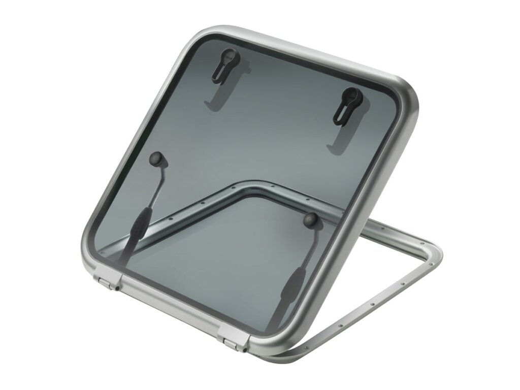 De luiken hebben een superieure oppervlaktebehandeling, dus de aluminium profielen zijn eerst gepolijst en vervolgens satijnglans geanodiseerd. Het acrylaatvenster is 10 mm dik in de kleur dark smoke.