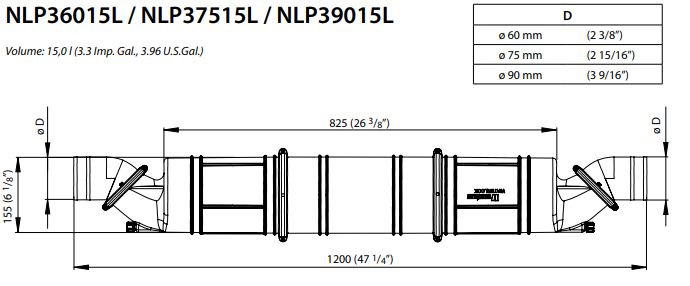 Net als de kleinere varianten is de 15 liter verkrijgbaar met aansluitingen voor verschillende slangdiameters: 60, 75 en 90 mm. Gecombineerd met de geringe hoogte (slechts 155 mm) is deze waterlock de ideale match voor schepen met een vermogen van 49 pk (36kW) tot 110 pk (81 kW) gemeten bij 0,1 bar tegendruk.