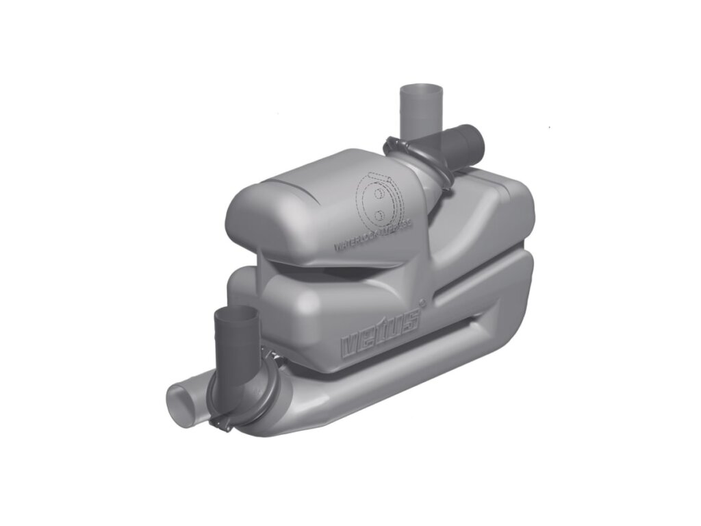 Waterlock die zeer geschikt is voor zeilboten met lange uitlaatleidingen. Inhoud 17 liter. Met draaibare 360 graden in- en uitlaat voor eenvoudige montage.