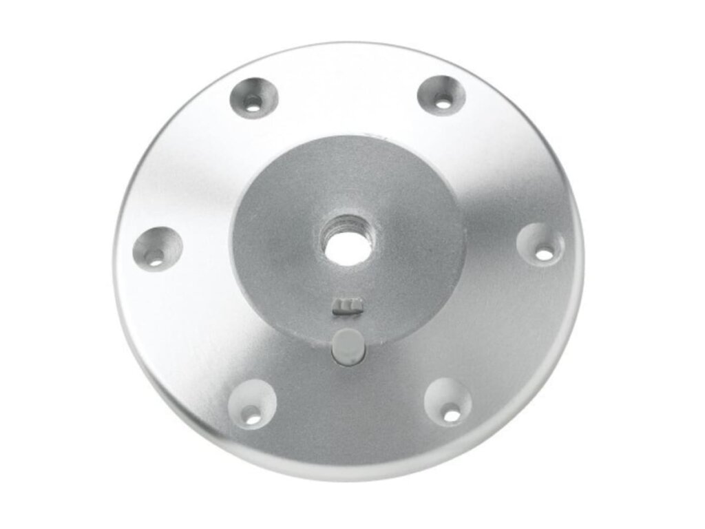 Voetstuk van gepolijst geanodiseerd aluminium voor tafelpoot met schroefverbinding en heeft een diameter van 178 mm.