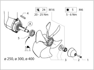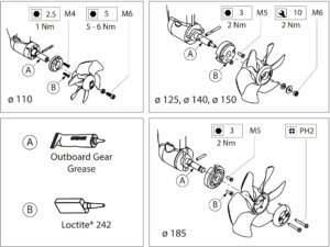 - Reinig de schroefas, vet deze in met ‘outboard gear grease’ en monteer de schroef terug op de as.